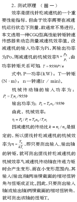 本测试系统是采集减速机输入轴和输出轴传感器输出的正弦信号进行处理的,主要经过滤波、整形、偏置微分电路处理后接到74LS74触发器,得到可反映转矩转速的矩形波信号,以此制作信号处理电路板,置于工业控制计算机中,编制相应处理软件,通过简单计算即可得到减速机的输入/输出转矩及输入/输出转速,相应得到其效率值。