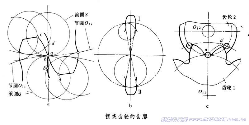 摆线针轮减速机齿轮传动分内外啮合和齿条啮合两种。齿条的齿顶和齿根都是滚圆在直线上滚成的摆线。这种传动还有一些变形齿廓(图中b[摆线齿轮的齿廓] )。