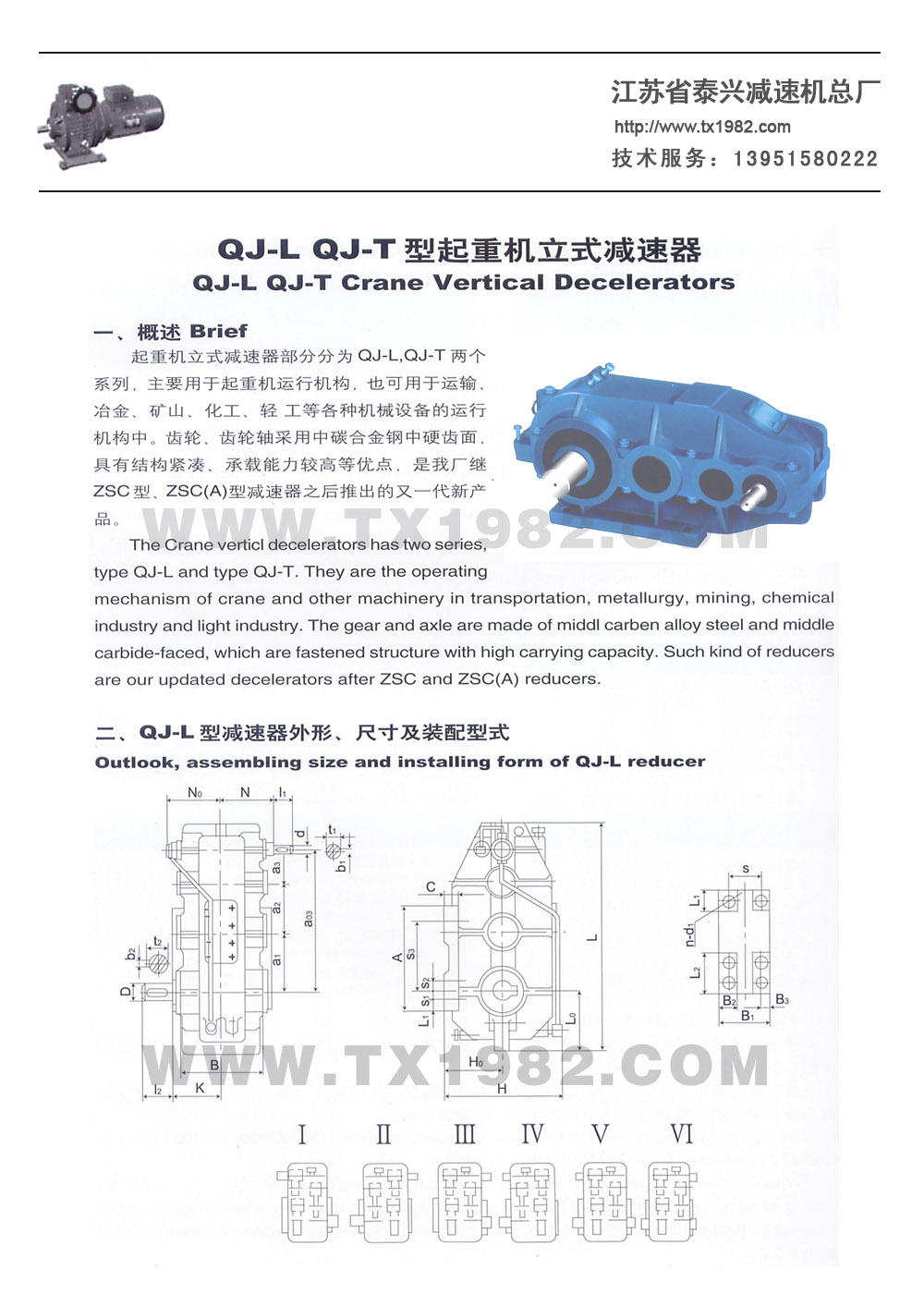 QJ-L型起重机用立式减速器(JB/T 8905.3-1999)为立式斜齿圆柱齿轮减速器,是QJ型减速器派生系列,主要适用于起重机的运行机构,也可用于运输、冶金、矿山、化工及轻工等机械设备的传动机构。