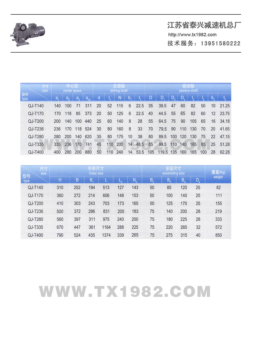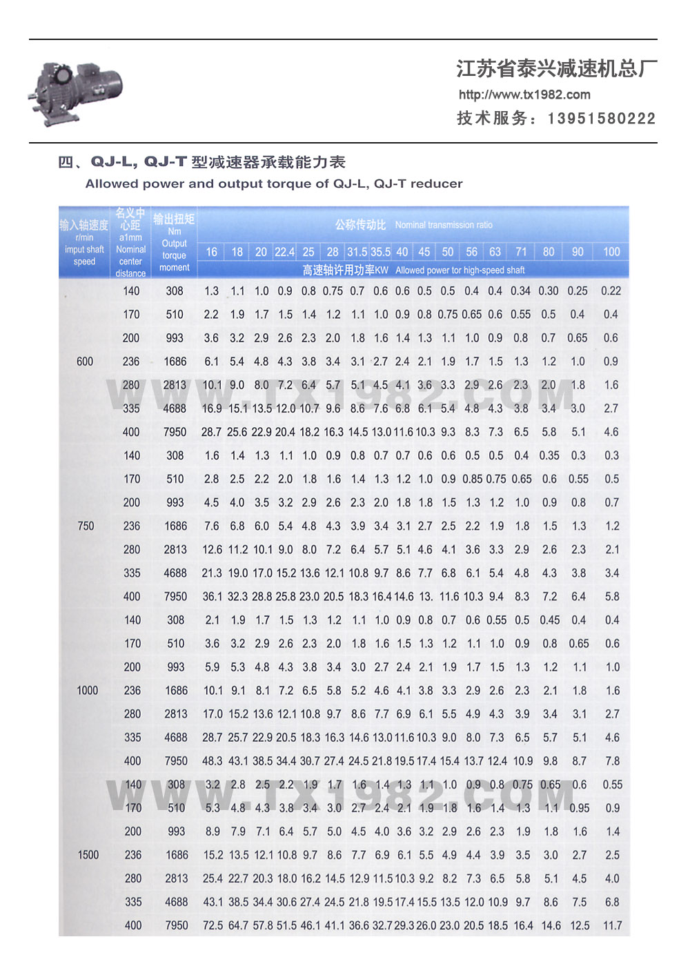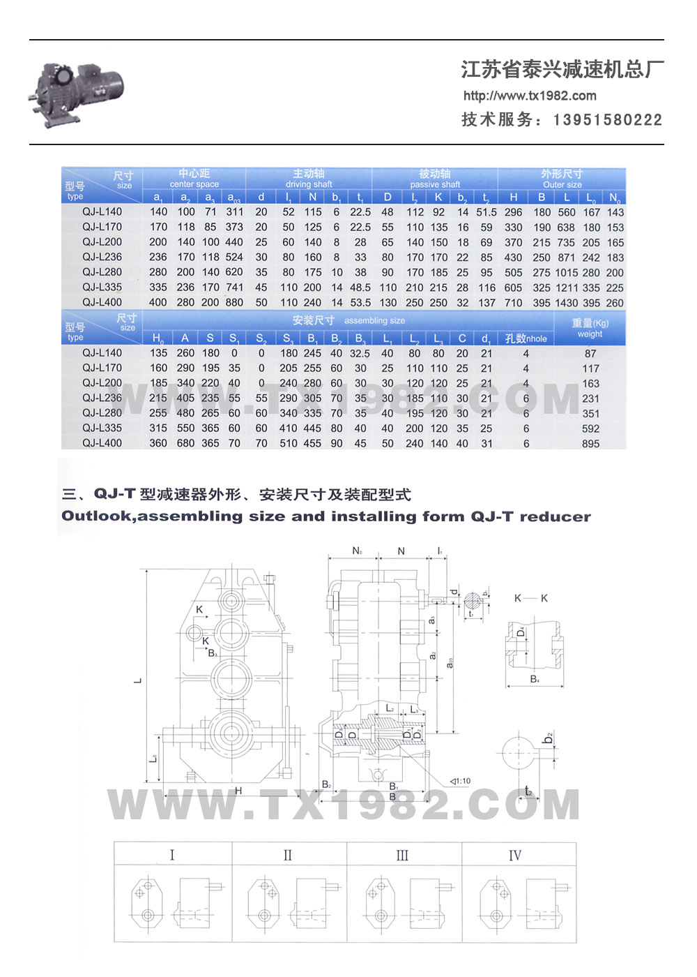 QJ-L型减速器高速轴和低速轴均采用圆柱型轴伸,平键联接。