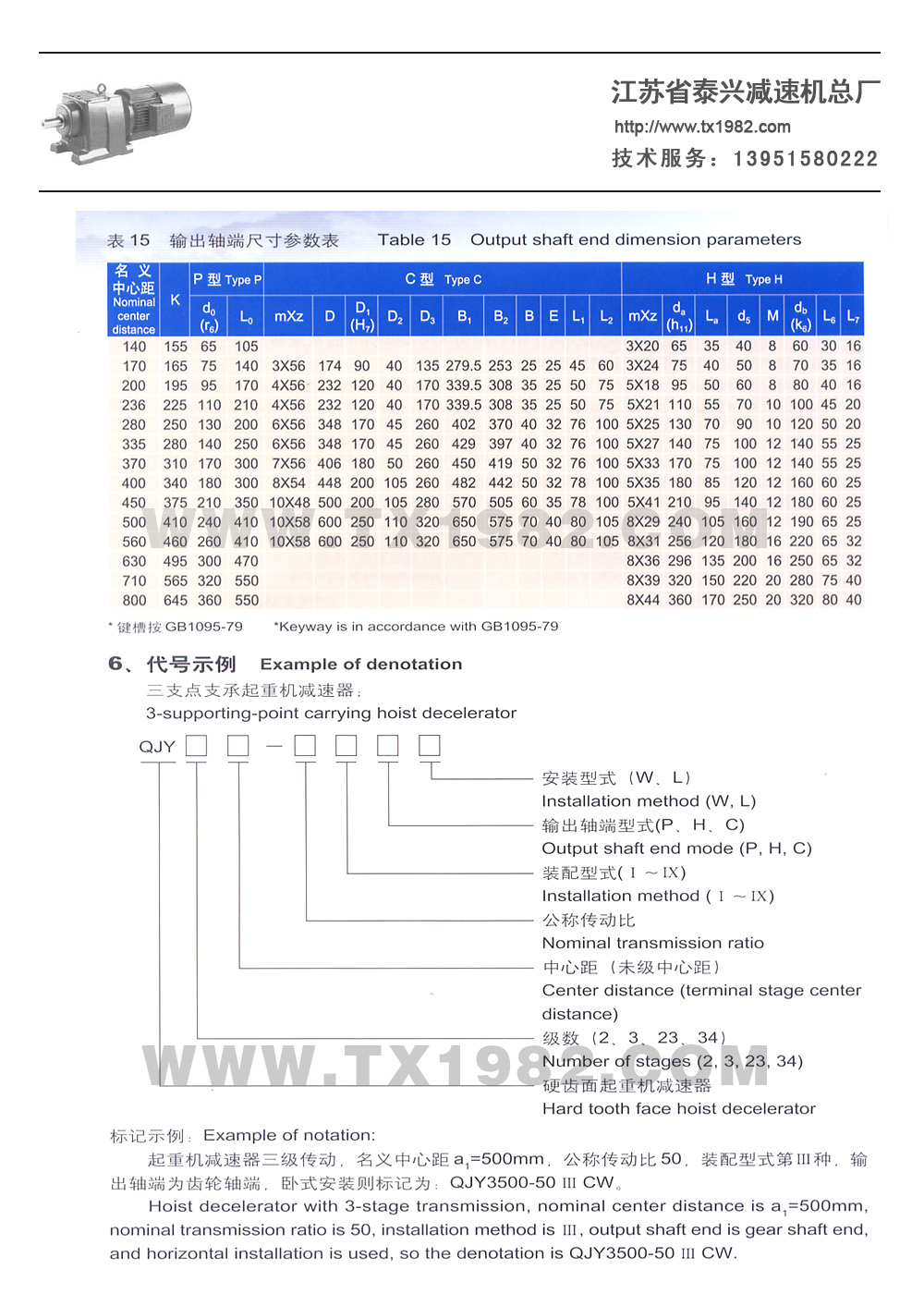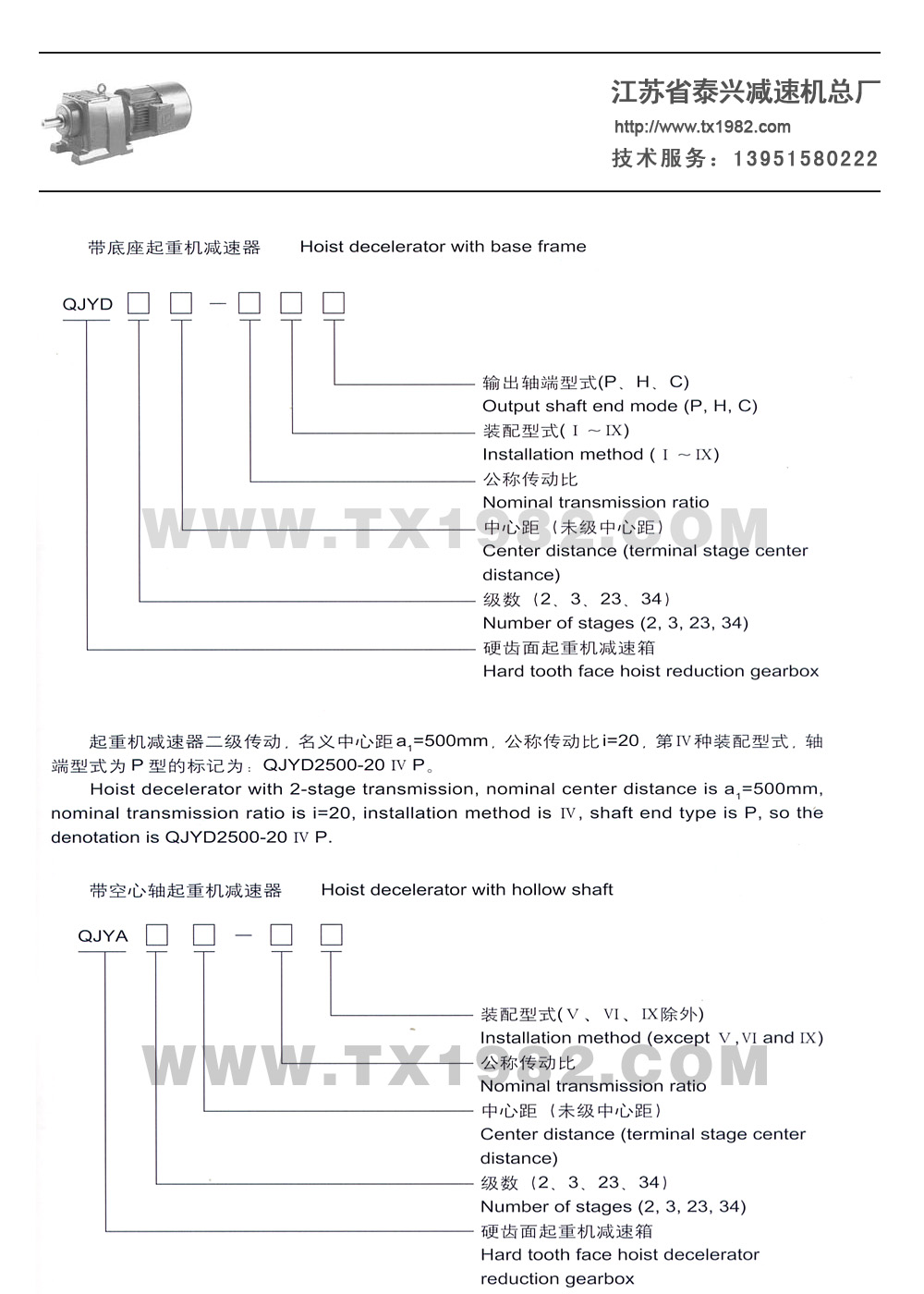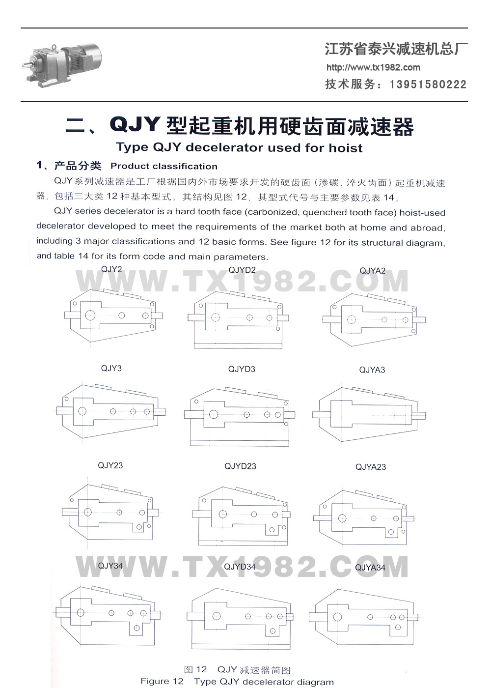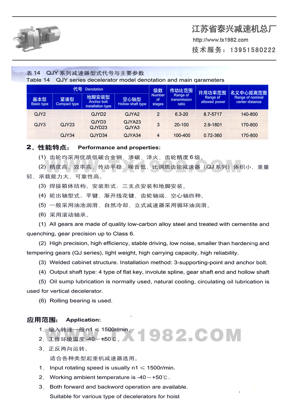 QJY系列减速器为根据市场需求开发的硬齿面起重机减速器,全系列包括QJY(三支点支承式)、QJYD(地脚安装)、QJYA(空心轴式)三大类十二种基本形式。该系列减速器齿轮采用低碳合金钢,齿面渗碳淬硬,磨削成形,具有承载能力大(较QJR、QJS减速器提高1.8~2.4倍)、传动效率高、使用可靠、寿命长等优点。 QJY系列减速器适用于起重机的各有关机构,也可用于运输、冶金、矿山、化工、轻工等各种机械设备的传动机构中。